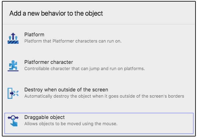 Al seleccionar el comportamiento del objeto arrastrable de la lista, podemos agregar la funcionalidad al objeto. Este comportamiento no tiene opciones para cambiar. Se aplica automáticamente al objeto.