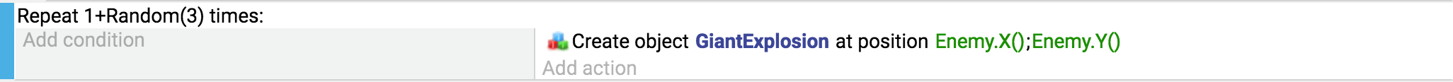 Tenga en cuenta que este recuento puede ser una expresión. Eso significa que puedes hacer que el número de repeticiones varíe según lo que haga el jugador. Por ejemplo, puede crear un número diferente de enemigos según el conteo de vida, la posición, etc. de un objeto. También puede crear un número aleatorio de objetos en la escena (consulte el ejemplo a continuación).