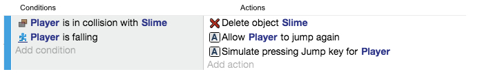 Los eventos se componen de una lista de "condiciones" que se muestran en el lado izquierdo de la pantalla y una lista de "acciones" que se muestran en el lado derecho de la pantalla. Cuando todas las condiciones de la izquierda son verdaderas, se ejecutan las acciones de la derecha. Si una condición de la izquierda no es verdadera, las otras condiciones y acciones en el evento no se ejecutan.