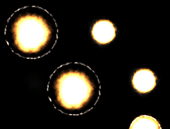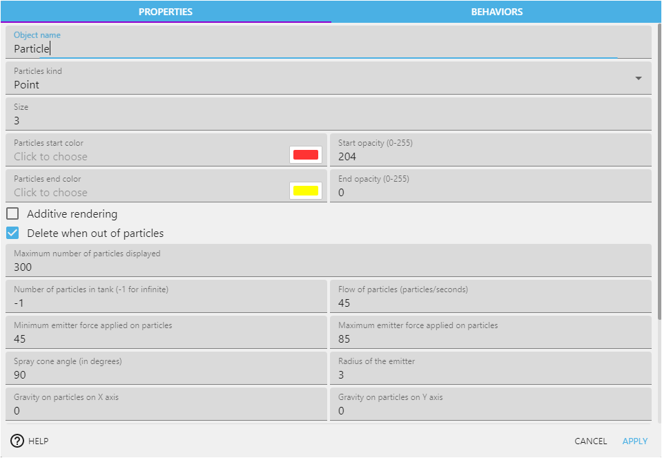Las partículas se emitirán en la dirección representada por el ángulo de los emisores en la escena. Puede cambiar el ángulo del cono de rociado, que también se representa en el editor de escenas como dos líneas: un gran valor para este "cono de rociado" dará como resultado una emisión de partículas en un gran número de direcciones. Un valor de 0 emitirá partículas solo en una sola dirección. * Las partículas aparecen en una esfera, alrededor de la posición del objeto emisor. Puedes cambiar el radio de la esfera. * La gravedad se puede aplicar sobre partículas, en los ejes X e Y. Por ejemplo, un valor negativo en el eje Y hará que las partículas suban en el aire. * La fricción influye en la desaceleración de las partículas con el tiempo.