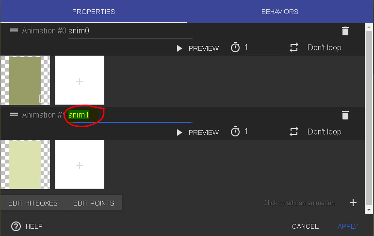 Cuando haya configurado varias animaciones para un objeto, puede usar la pestaña de eventos para ''establecer la animación por nombre'. Esto se controla en la sección Agregar acción de la condición. Permitirá cualquier condición que use en la sección de agregar condición para cambiar a la animación correcta cuando ocurra el evento.