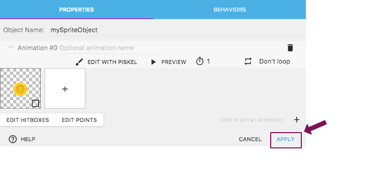 Finalmente, para guardar las propiedades del sprite, haga clic en el botón "Aplicar" ubicado en la esquina inferior derecha del panel.