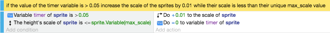 El editor de escenas (eventos) también se puede usar para cambiar el tamaño de un sprite en mosaico. Usar el editor de Eventos hace que el juego sea más fluido e interesante.