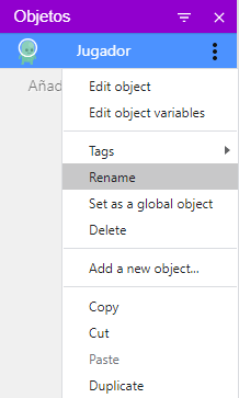 ) y elija renombrar. Luego puede escribir "Jugador" y hacer clic en cualquier lugar de la pantalla o presionar la tecla Intro para cambiar el nombre del objeto.