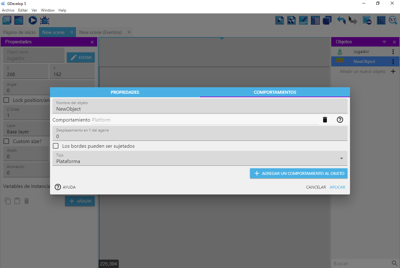 para agregar un comportamiento al objeto. Elija Objeto que se desplaza sobre plataformas