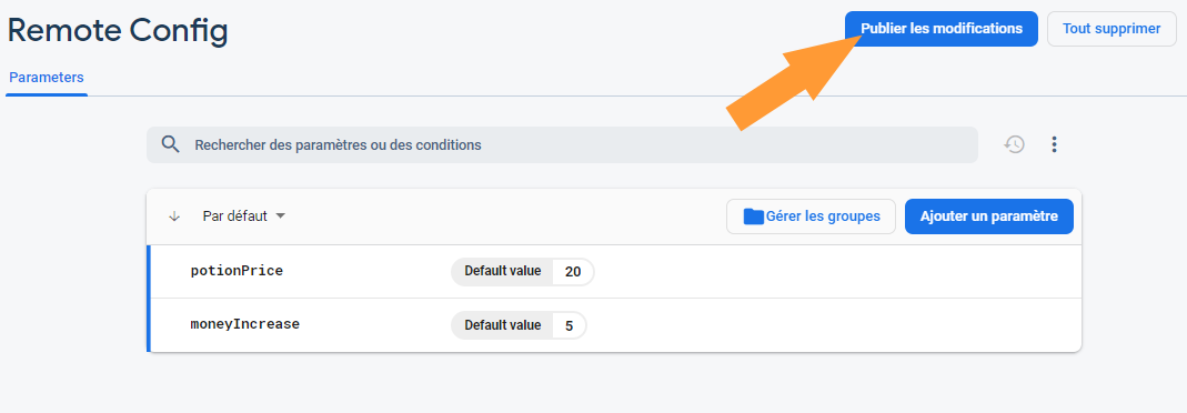 La configuration distante Firebase te permet de changer des paramètres de jeu pour tout tes utilisateurs ou une partie d'entre eux depuis le net. Par example: tu peux augmenter la difficulté du jeu a distance uniquement pour les joueurs expérimentés qui se plaignent de la facilité du jeu sans avoir à déployer un patch. \<note>Pour pouvoir sélectionner des groupes de joueurs efficacement ça aide d'activer les Analytics et l'Authentification