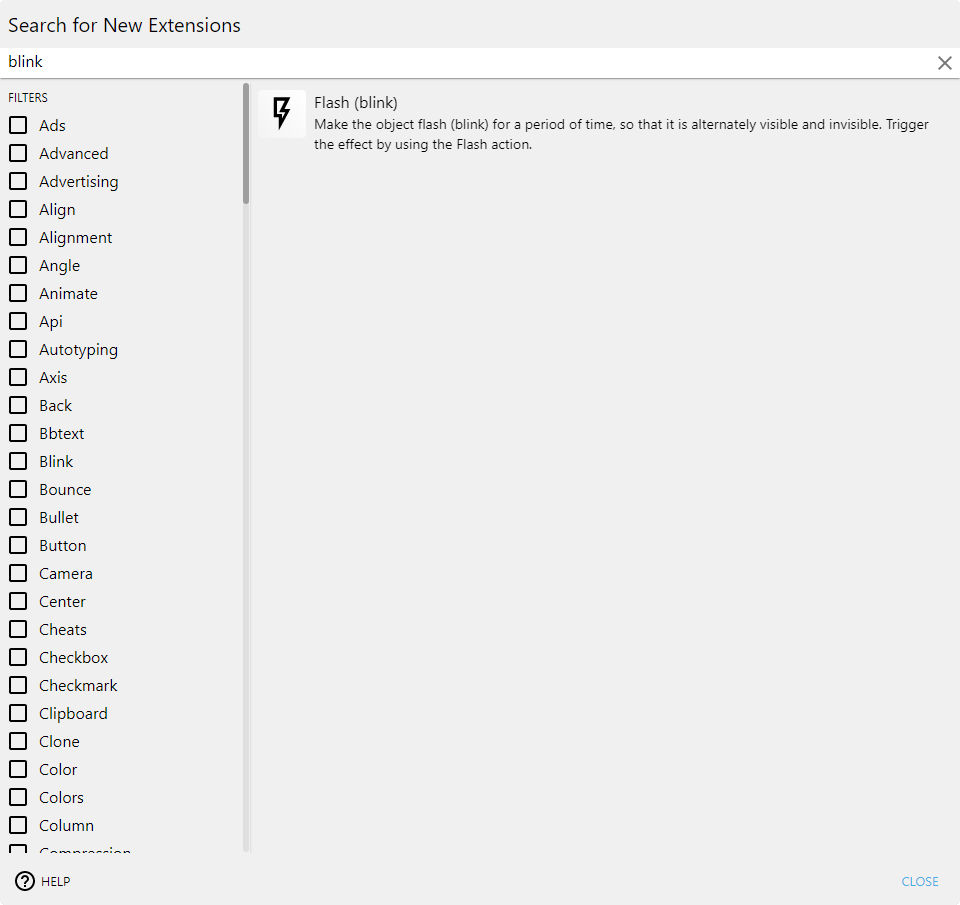 La description explique généralement comment utiliser l'extension. Ici, c'est un comportement que vous pouvez ajouter à un objet, avec une action pour faire clignoter l'objet pendant un certain temps (comme dans un vieux jeu de plateforme, quand vous êtes touché par un ennemi).
