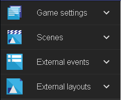 - Scènes: Les scènes sont les différents niveaux de votre jeu mais que ça, dans GDevelop tout est une scène, le menu principal, le splash screen, les crédits: Toutes ces catégories sont des scènes.
