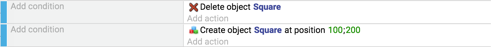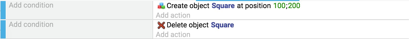 - La première paire d'événements crée un objet "Square" (Carré) à la position 200;100 et le supprime immédiatement. Aucun "Square" n'est affiché à l'écran (car il a été supprimé dans la fraction de seconde de sa création).