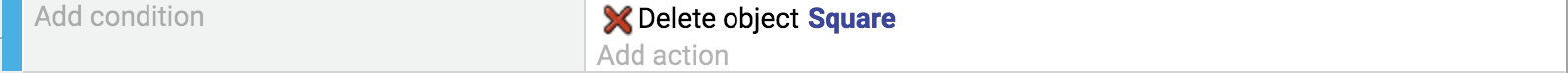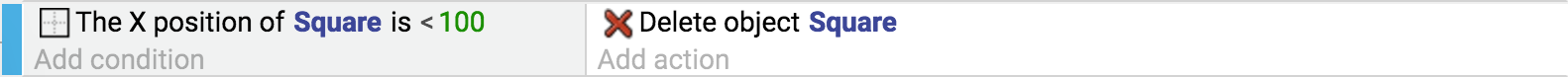 Tandis que l’événement suivant supprimera seulement les objets "Square"(Carré) dont la position X est inférieur à 100 pixels:
