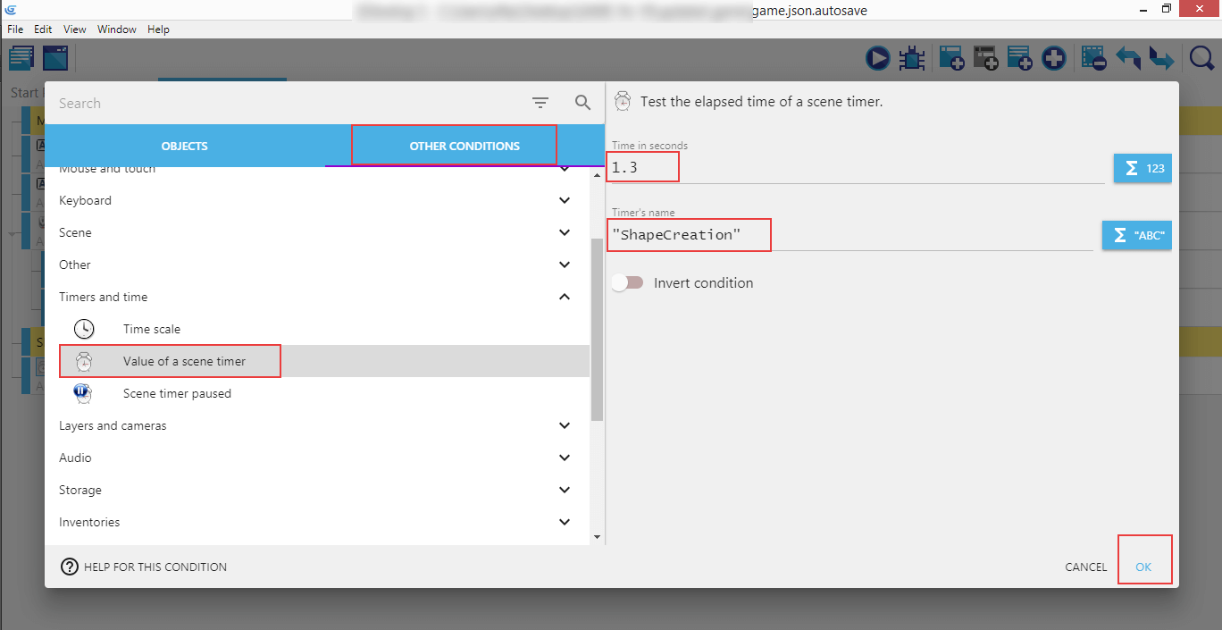 Ensuite, dans la liste déroulante, sélectionnez Value of a scene timer (Valeur d'un chronomètre de scène) et entrez deux valeurs. La première est 1,3