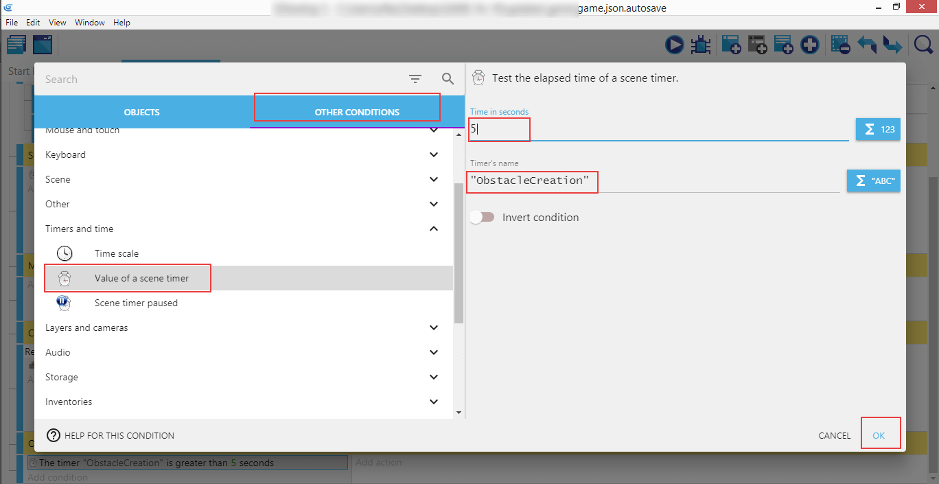 Activez Timers and time (Temps et chronomètre), sélectionnez Value of a scene timer (Valeur d'un chronomètre de scène). Dans le panneau de droite, entrez 5