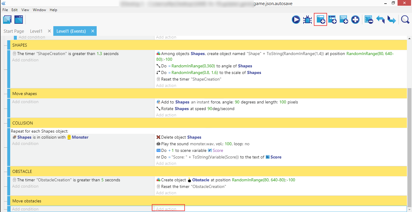 (déplacement des obstacles) puis un autre événement vide dans lequel vous créez une nouvelle action (Add action).