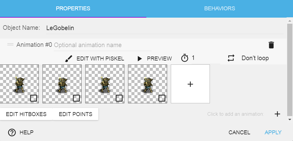 Il est un peu fade ce Gobelin, pour lui ajouter des animations, il faut retourner aux propriétés de l'objet. Pour cela , cliquez sur , puis sélectionnez Edit Object. Nous allons ajouter avec le +, et ajouter goblin_frame_1.png, goblin_frame_2.png et goblin_frame_3.png, soit :