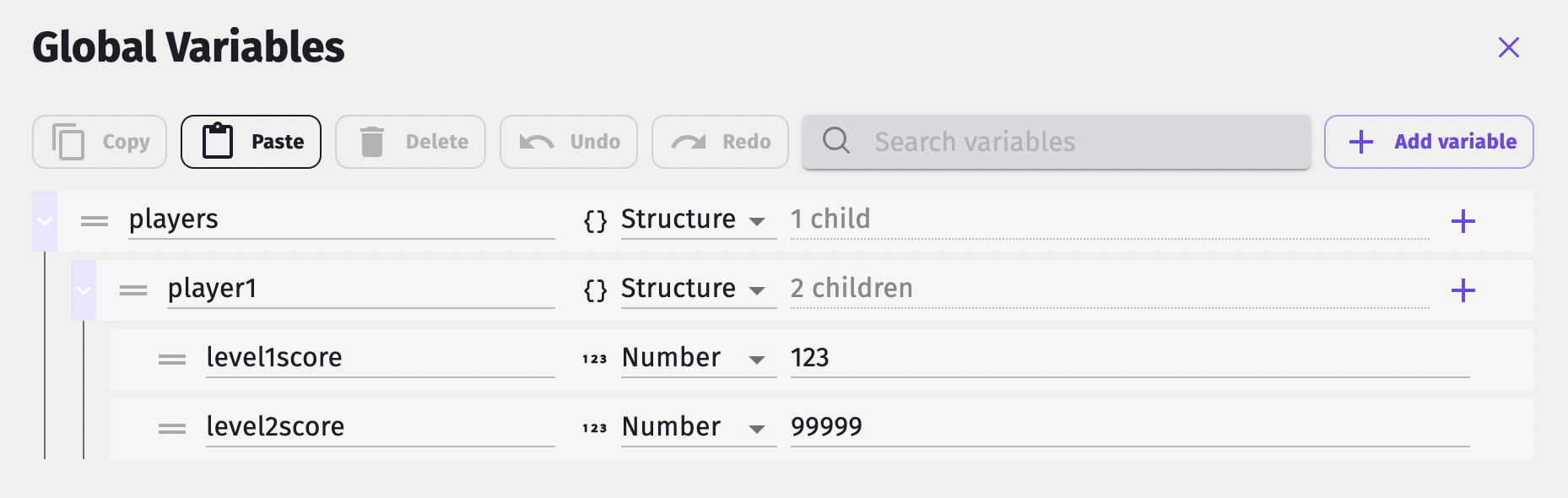 A Structure variable maps names to variables. For example, a simple structure can map the name "Hello" to one sub-variable and the name "World" to another sub-variable. You can use this data type to organize related variables within a single variable. In programming languages, this data type is often referred to as an object, map, hash, or dictionary.