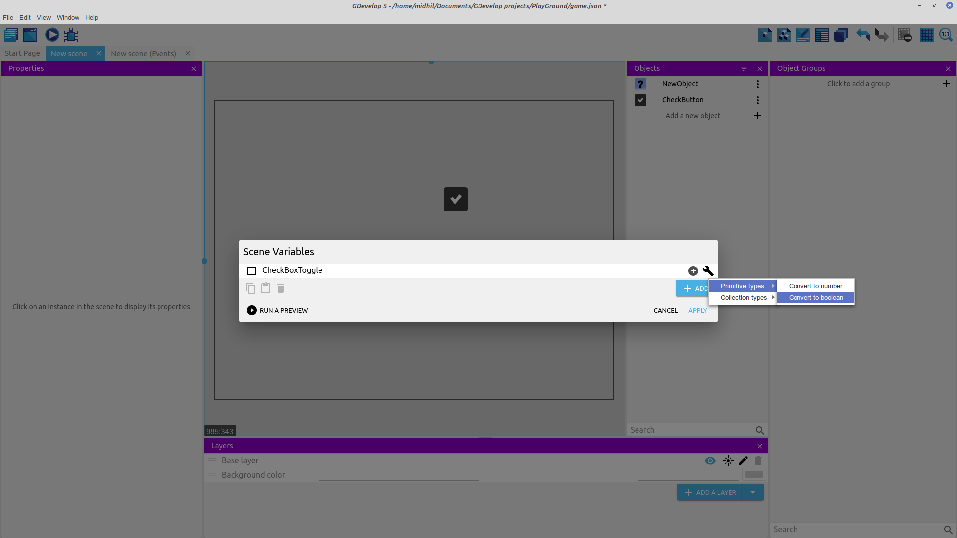 For example, if you reference a variable that doesn't exist in an action or condition, GDevelop automatically initializes the variable with a default value. The default value is determined by the data type of the variable: