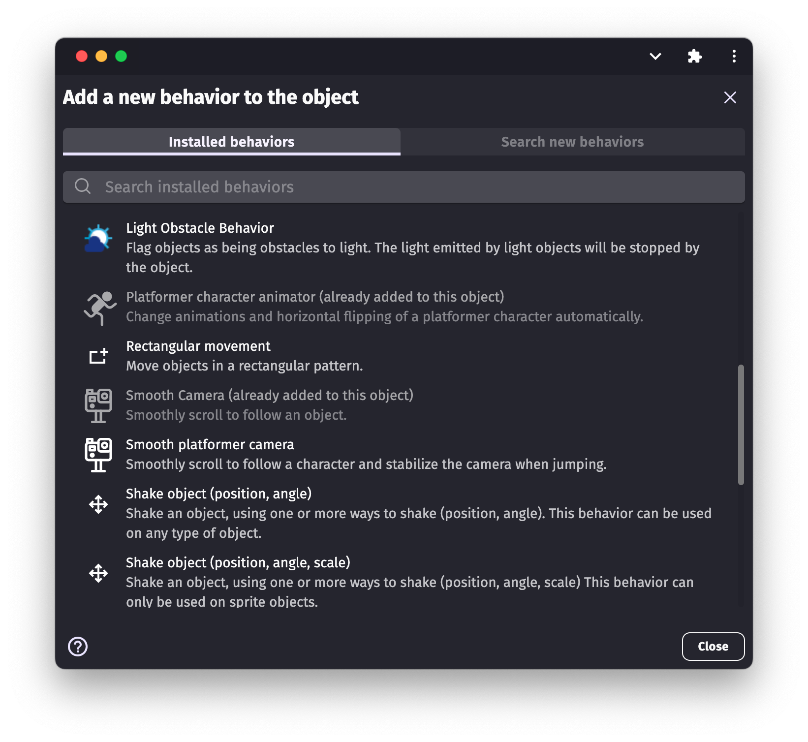 Installed behaviors appear in the Installed behaviors tab:
