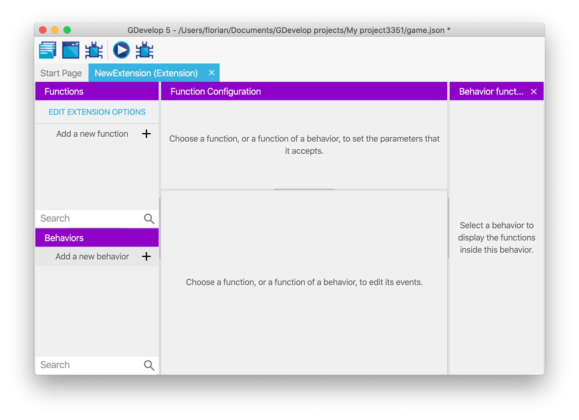 Click on the extension in the list to open its editor. By default, there are no functions in the extensions. Add one by clicking on Add a new behavior, on the left:
