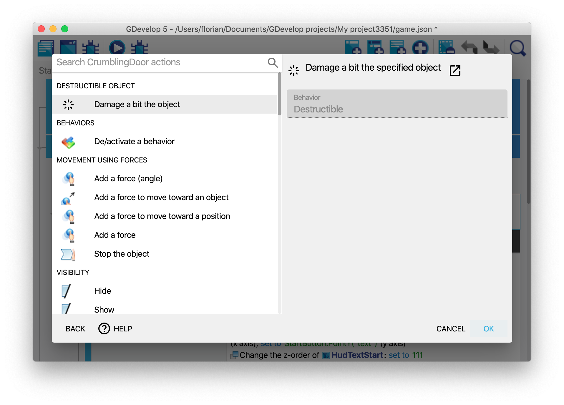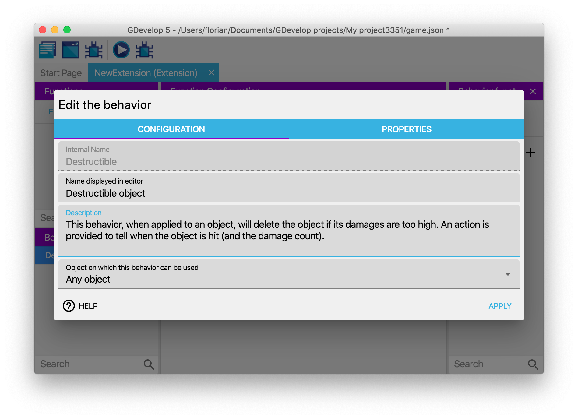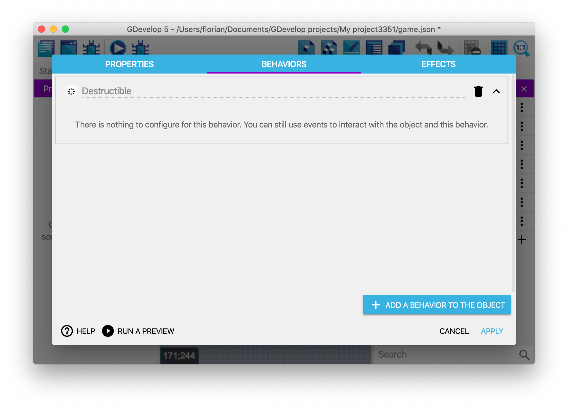 Here, you can see the "Destructible Object" behavior for example (that was created in the previous screenshots):