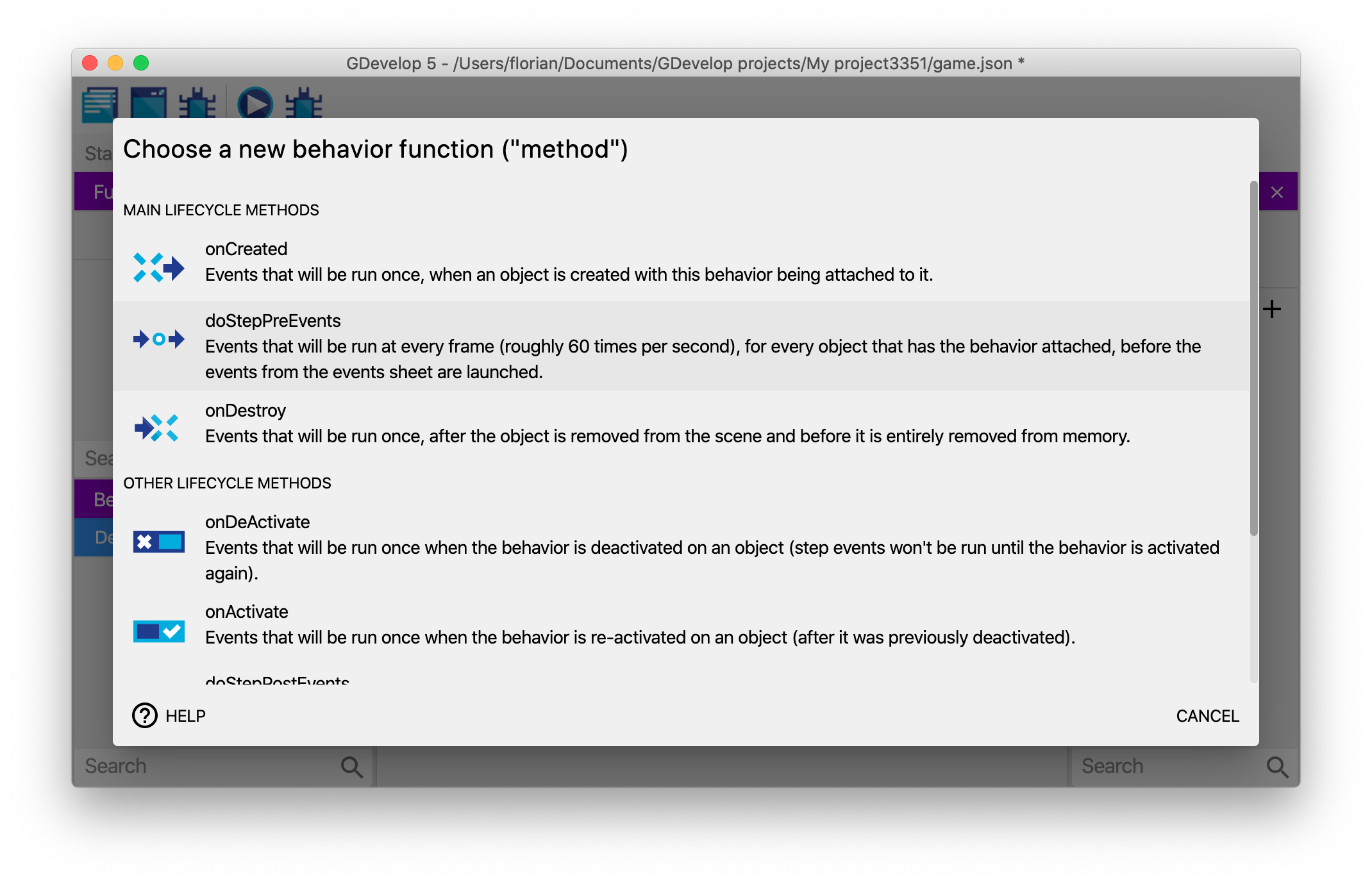 By default, a behavior is empty and does nothing. To add interactivity, you can add a new function (also called "method"). You'll be given the choice between some predefined functions, called lifecycle methods, or a custom function. Lifecycle methods will be called by the game engine automatically at some key moment during the game. Custom functions will be available as conditions, actions or expressions (like usual functions outside behaviors).