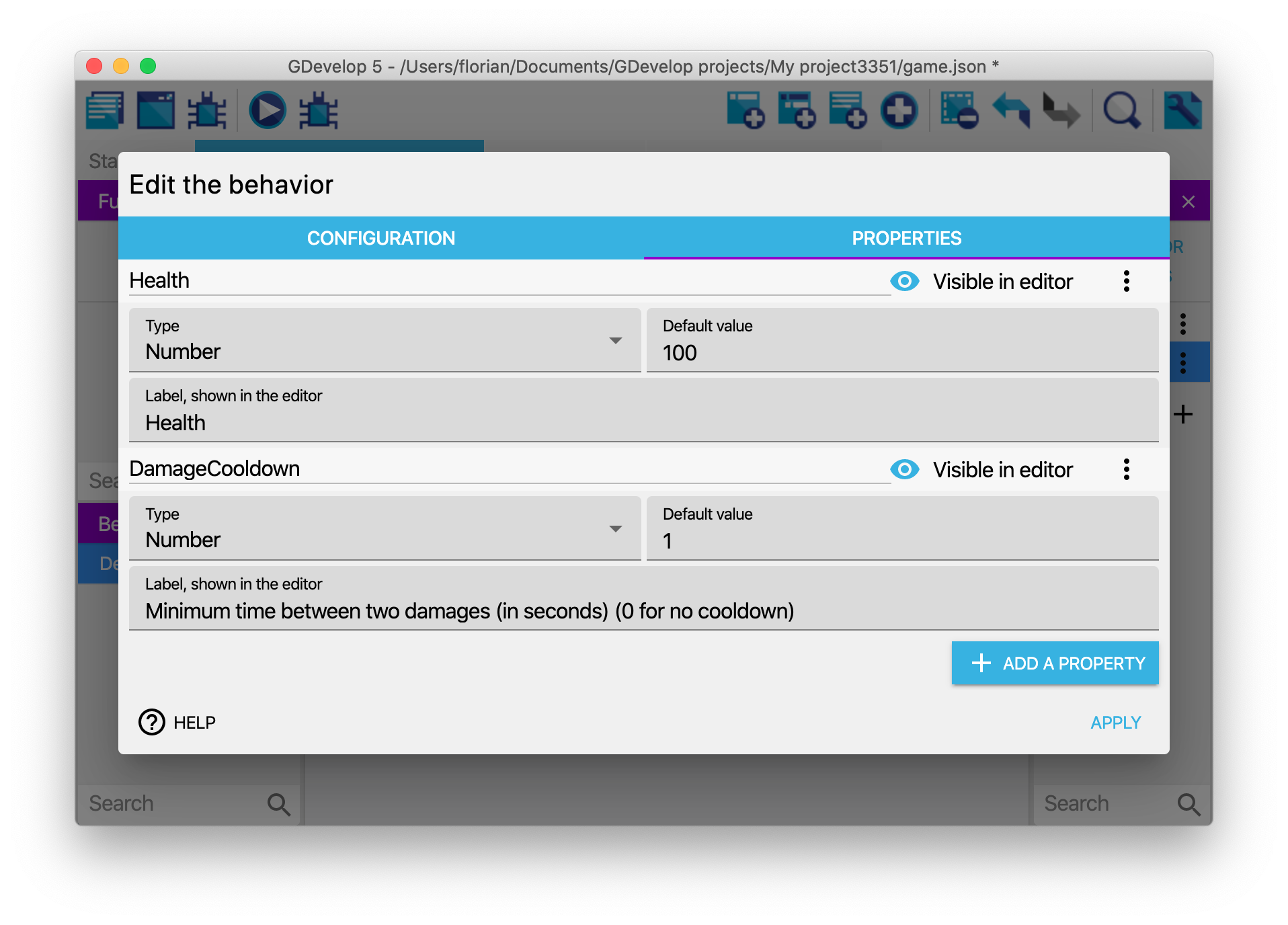 To show and add properties to your behavior, edit it and click on the "Properties" tab. In this example, you can see a behavior called "Health", that has properties to store the health of the object and the minimum time between two hits on the object: