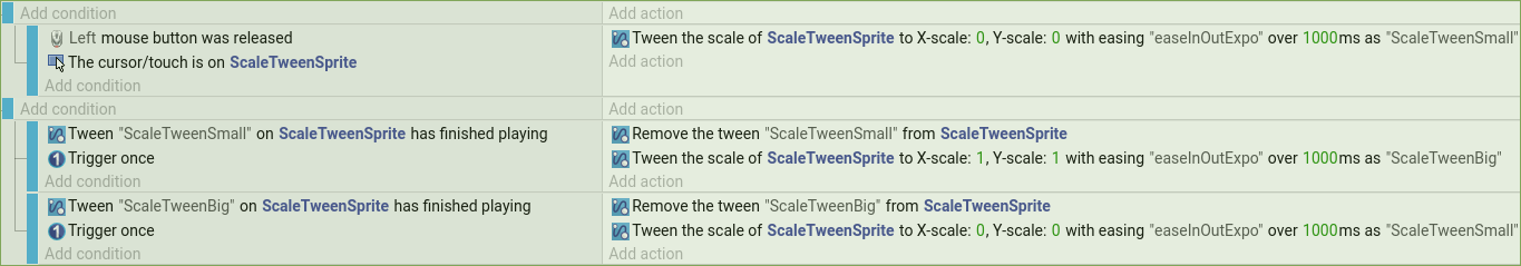 Tweens can be played in a sequence if you want to create more complex animations. This is called "chaining." In the following example, the sprite starts playing a "Tween the scale" animation to shrink it down when it is clicked with the mouse. After the tween has finished, a new tween animation starts to scale it up again. This creates a loop, which makes the sprite pulsate for all eternity. A variation of this can also create platforms that move up and down or enemies patrolling between waypoints.