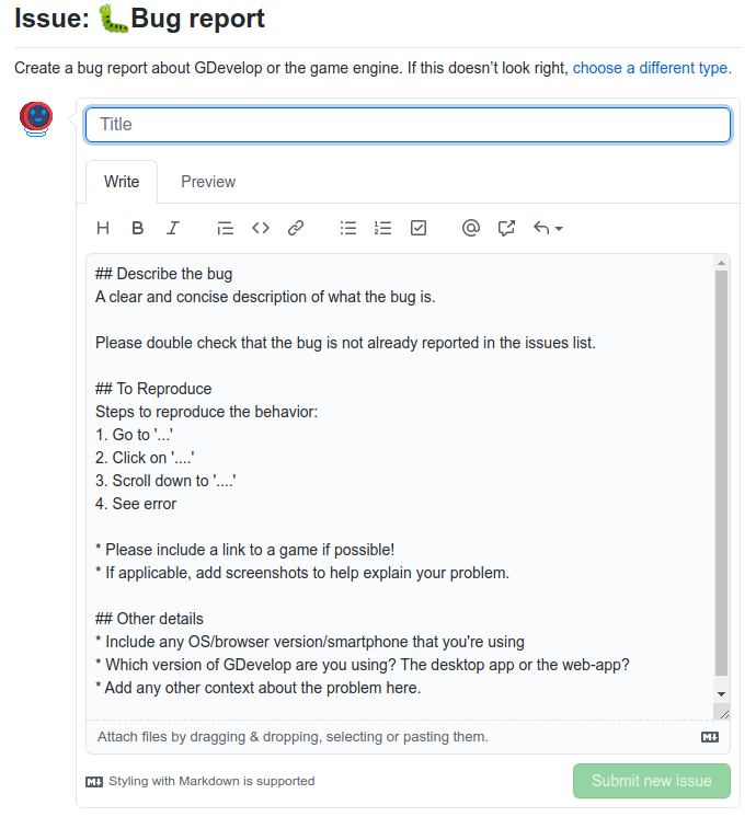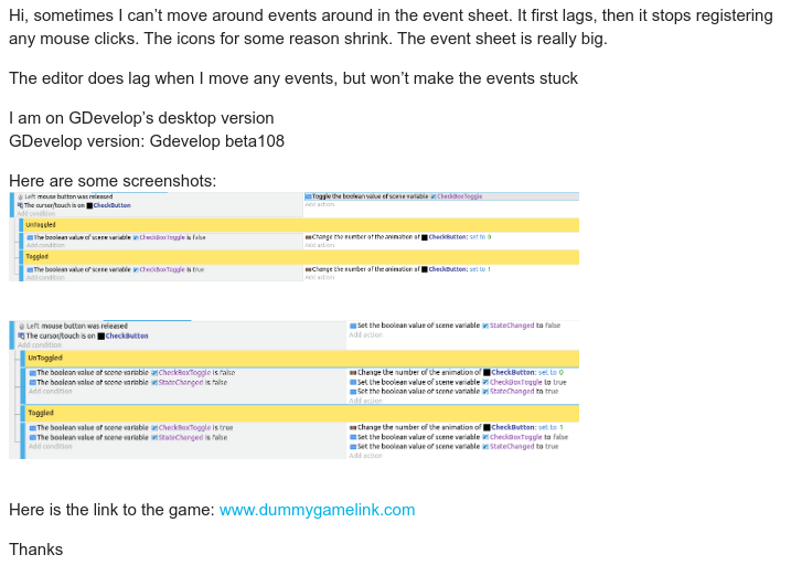 Reporting a bug or a crash is a great way to contribute to GDevelop and also fix some issues you might be having with GDevelop. Here is a guide for making a great bug report.