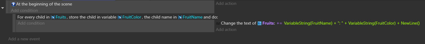 This event will store the value of each child variable (as a string or number) and the name of the child variable (as a string) into scene variables. The names of these scene variables are defined in the event parameters.