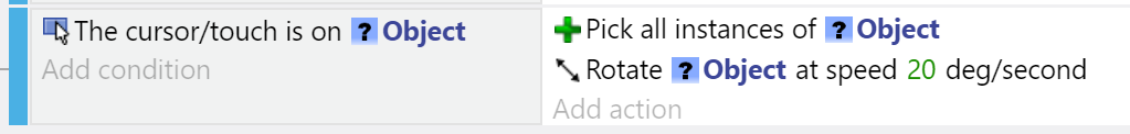 - Conditions and actions (if they are not special object picking actions) are executed for each picked instance.