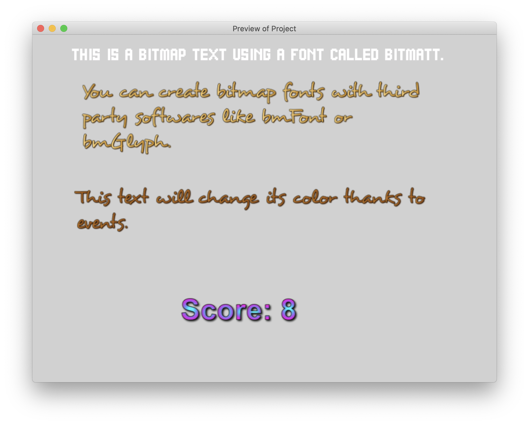 - Bitmap Font : This file contains the data related to characters that can be draw, the engine use these data for knowing which characters render on screen. File format must be FNT or XML.