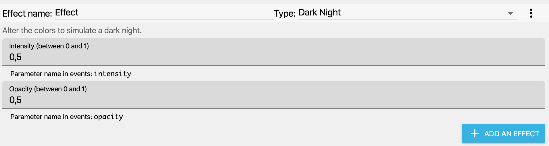 In this example, the Dark Night effect is called "Effect" and has two parameters "opacity" and "intensity":