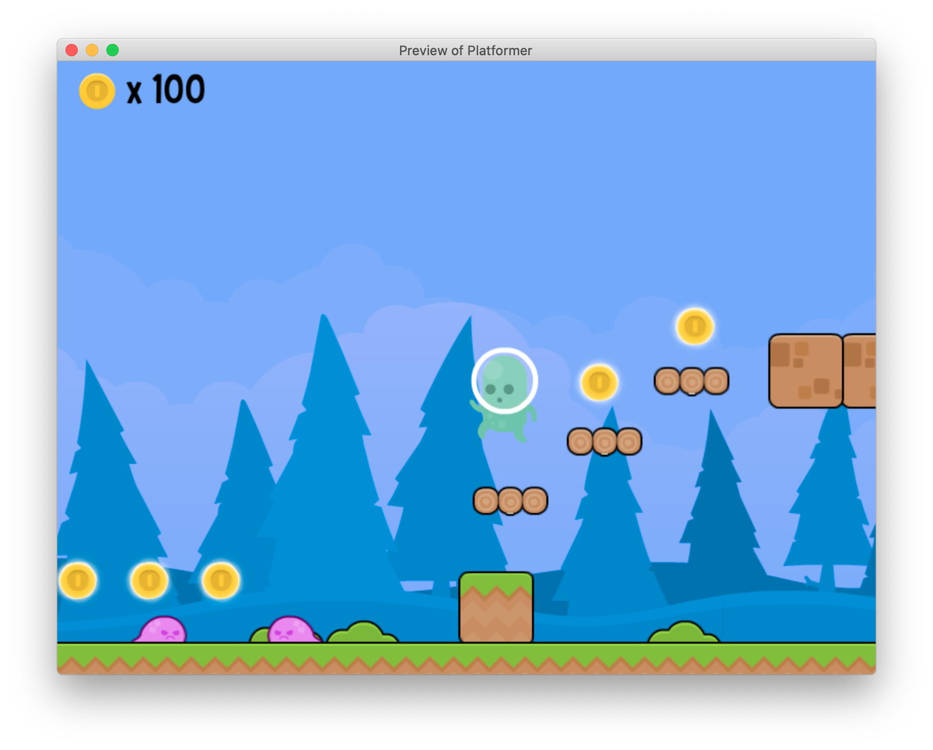 This game screenshot shows multiple objects with a Outline effect (giving the level a cartoon aesthetic), and the coins with a Glow effect.