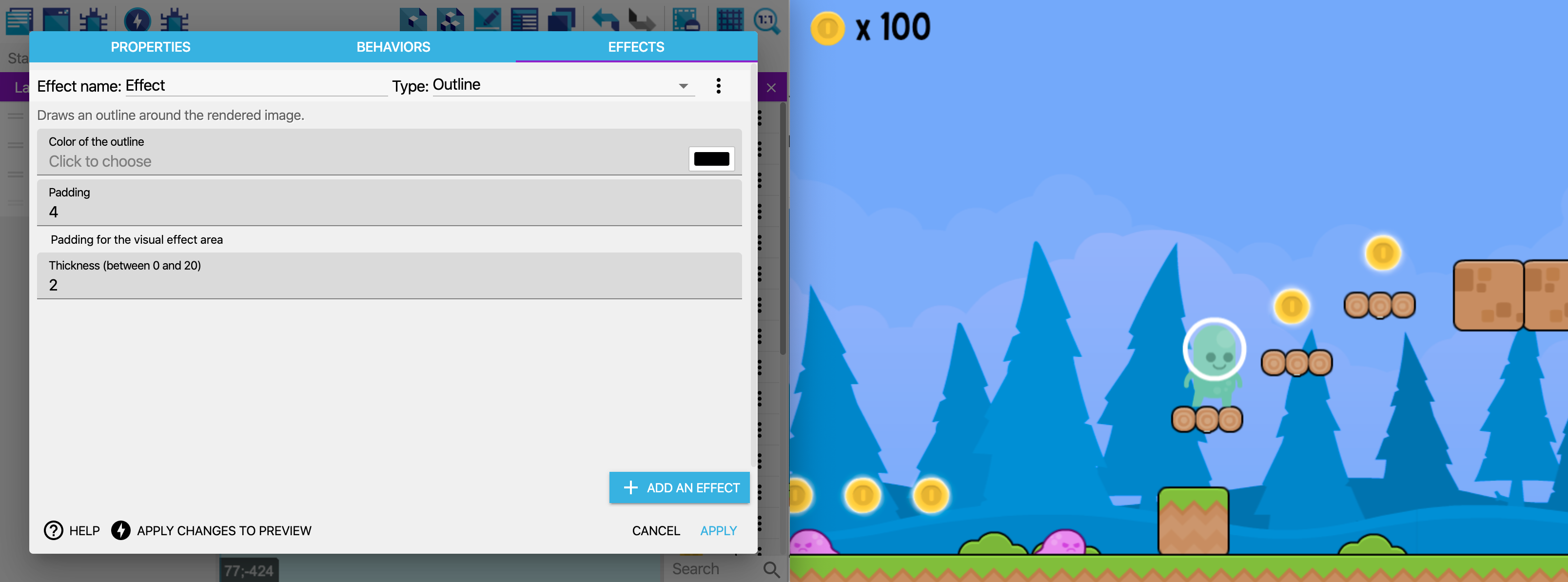 Click Add an effect. A new effect called “Effect” is created. This name will be useful later for modifying the parameters of the effect during the game.