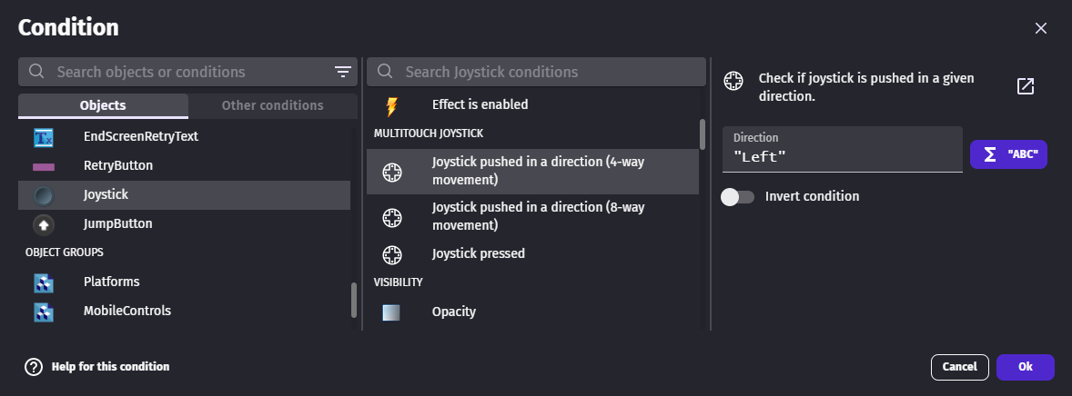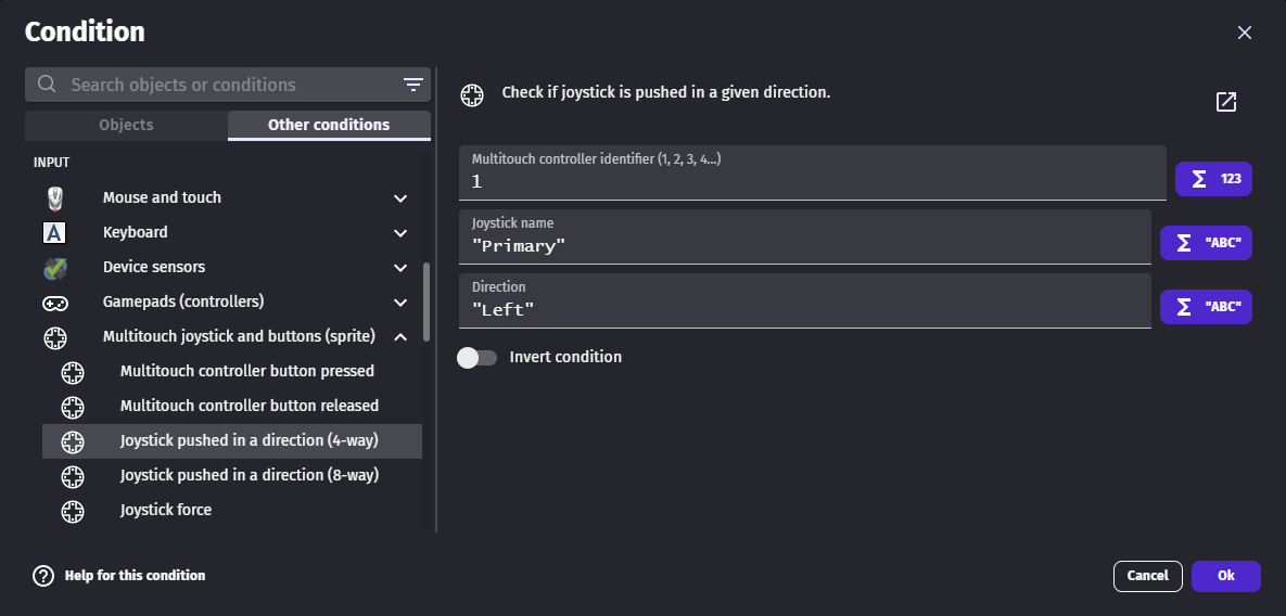 Joysticks and buttons can be used for any movement in a very similar way than real gamepads. Interactions of each player can be checked with the conditions on the following screenshot.