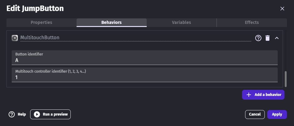 - Create a sprite object - Attach a "Multitouch button" behavior to it