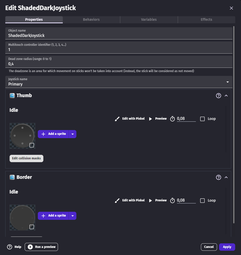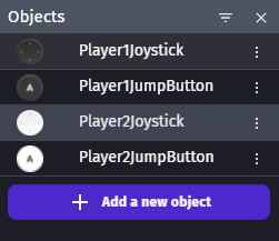 A joystick object can also be created from scratch. It needs an image for the border and another one for the part that follow the player finger.