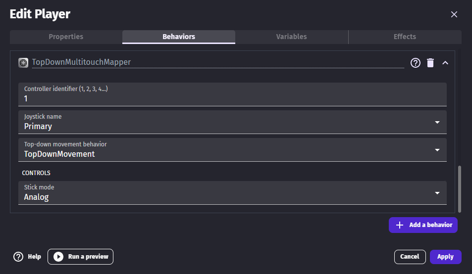 The "Platformer multitouch controller mapper" behavior can be added to the character to make the character move according to player touches automatically.