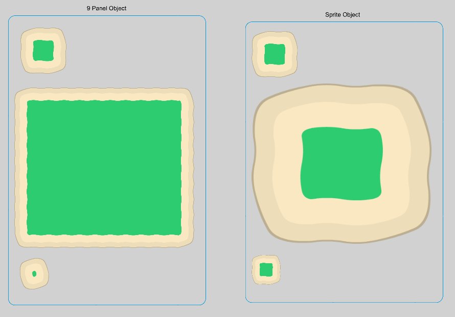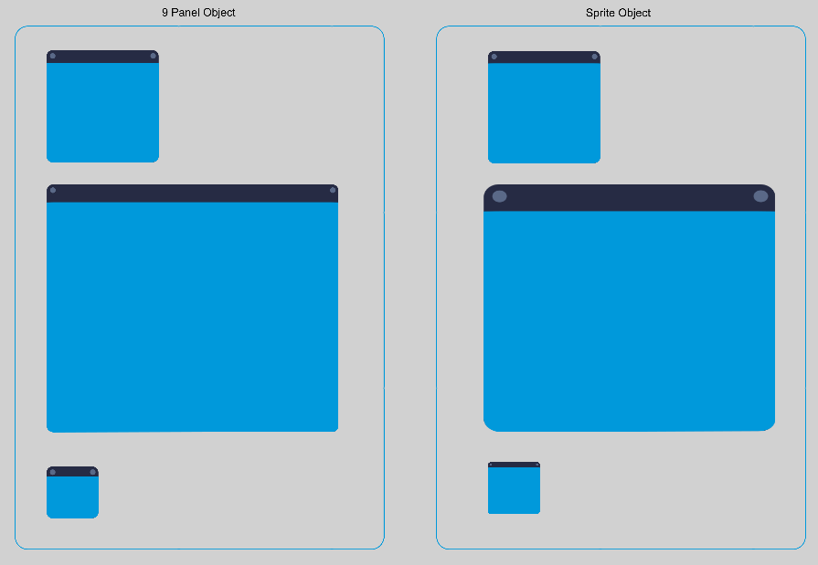 While the normal sprite object's texture is scaled as a single segment, the 9 patch sprite object's texture is scaled as different segments, keeping their proportion and also keeping the texture's quality.