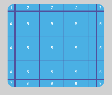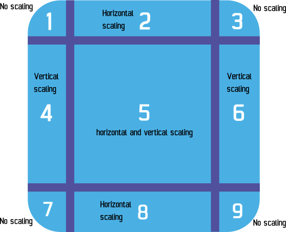 The texture is split into 9 segments, 1 to 9. Each of those segments will be scaled separately. You can see that segments 1, 3, 7, 9 keep their size and do not get scaled, while segments 2, 8 get scaled only horizontally, 4, 6 get scaled only vertically and segment 5 getting scaled both horizontally and vertically.