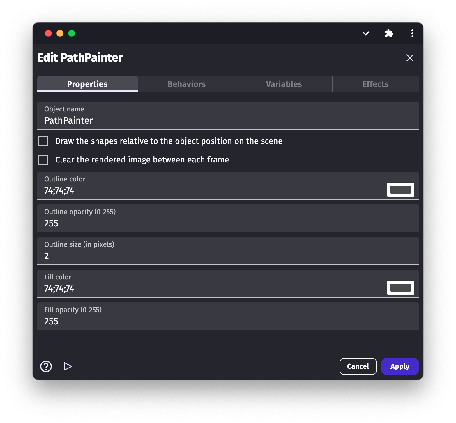 The shape painter has many properties allowing to define how the shapes will be drawn on screen: