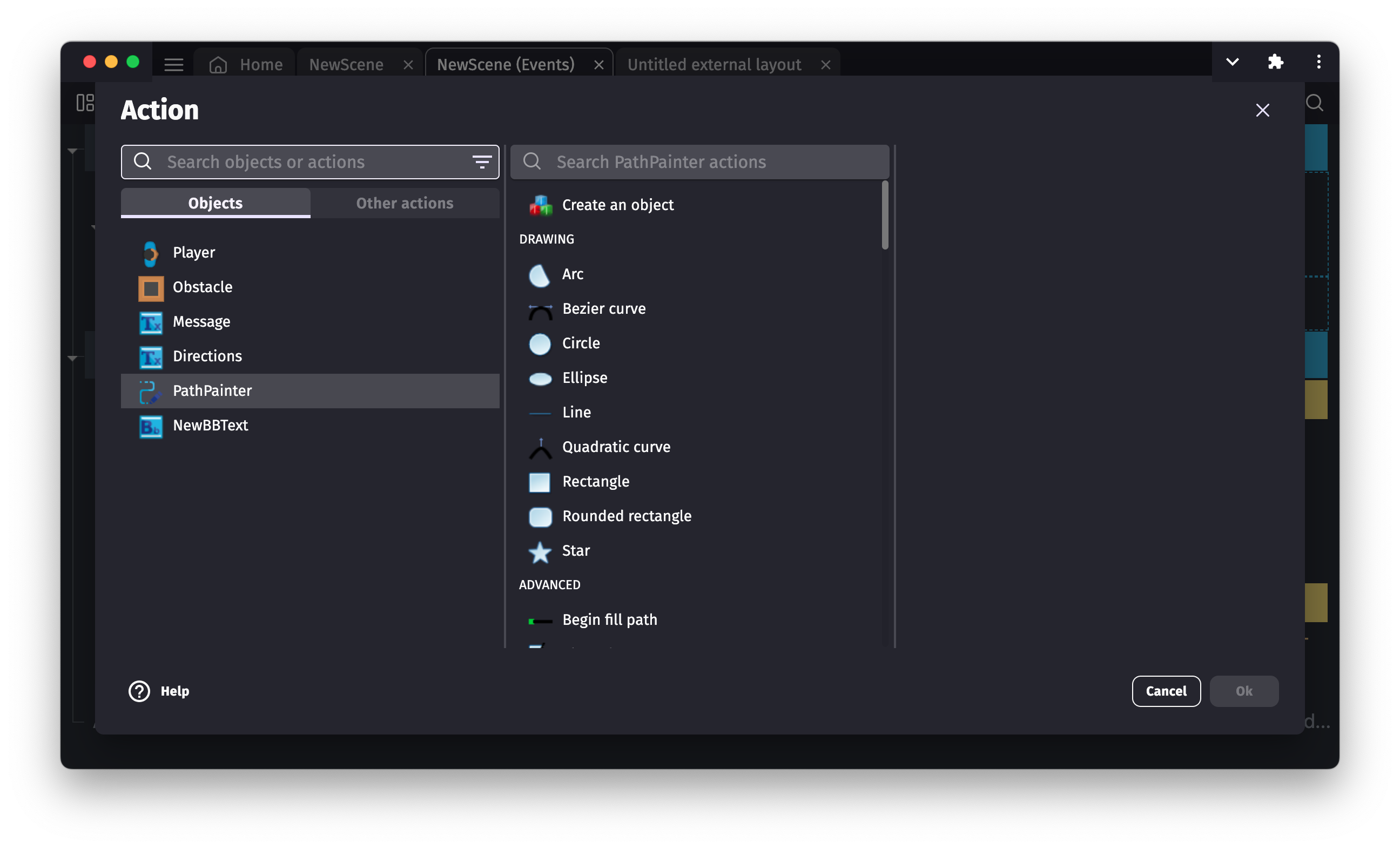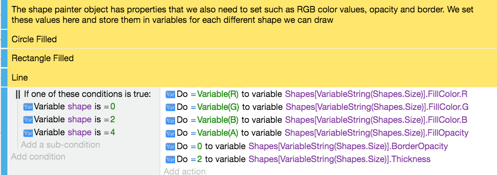 When you add an action in an event, select a Shape Painter object to display a list of shapes that can be drawn: