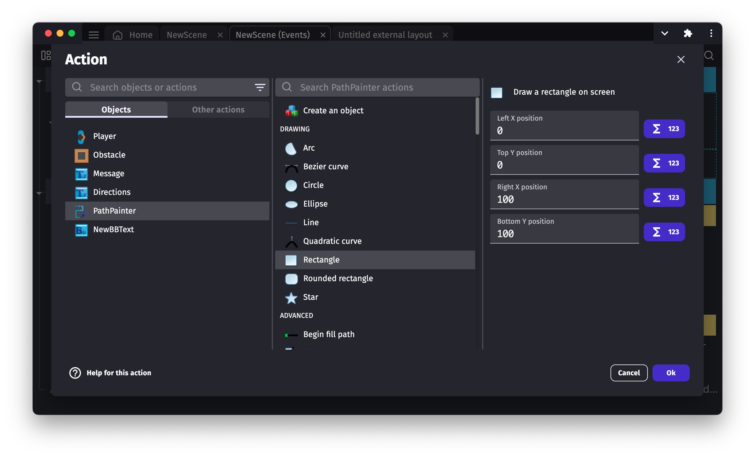 As an example, we are going to draw a rectangle on the screen. Select the Rectangle in the actions. For the top left position enter 0 for both X and Y. For the bottom right position enter 100 for both X and Y.