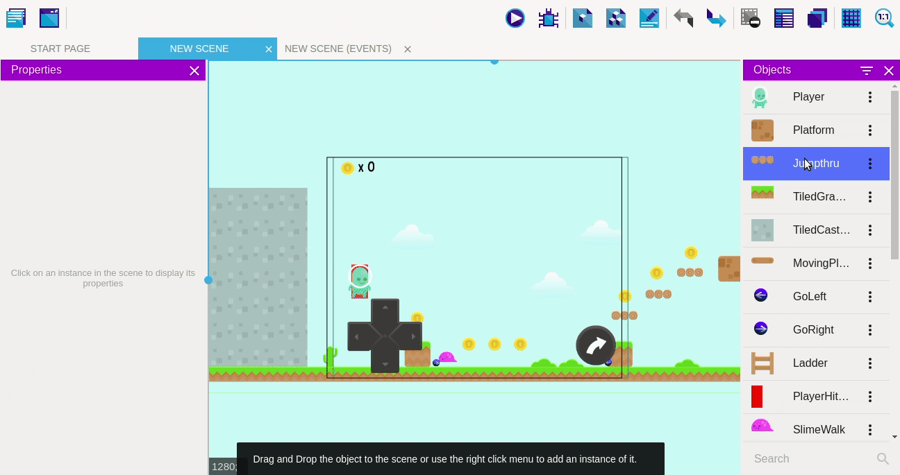 To add a sprite to your scene, select the "Click to add an object" option located on the right at the bottom of the objects panel.