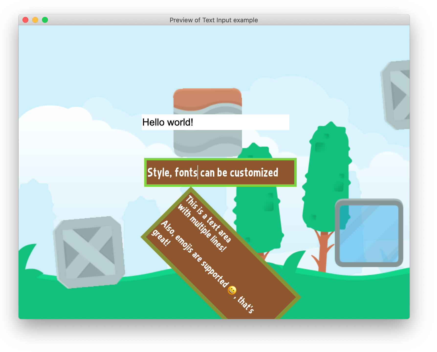 Text Inputs can be customised and are using the native platform user interface to be rendered on top of the game. According to the platform, small variations can happen in the rendering of the field. On touch devices (Android, iOS), a keyboard will be shown on screen, reducing the size available for the game. The player can use the keyboard as usual (as well as select the text, copy, paste, insert emojis, as in any other app).