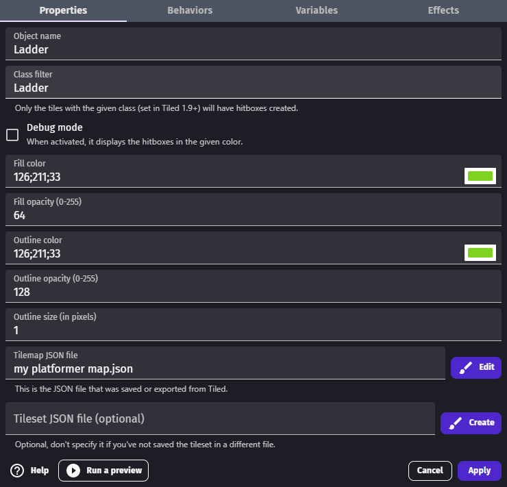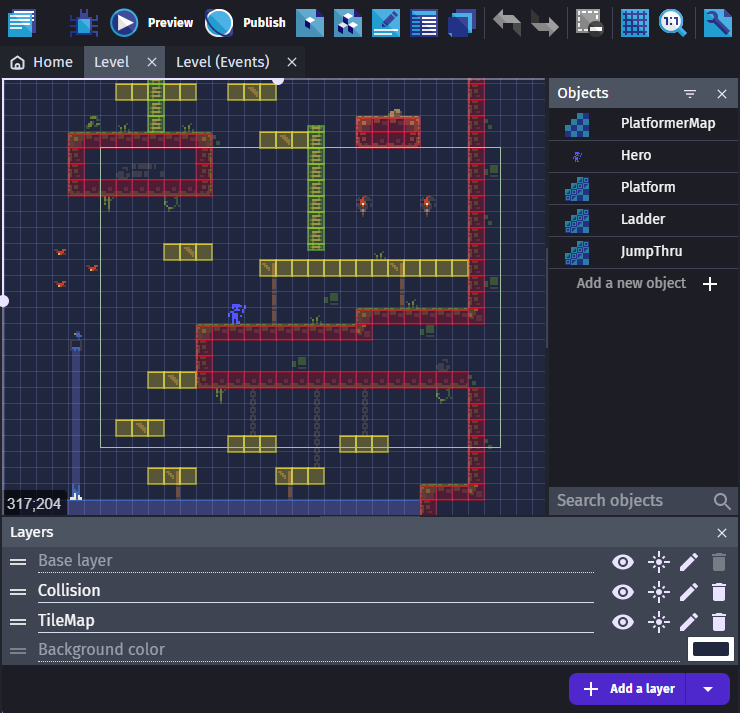 For now, this object is meant for advanced users as it requires Tilemaps to be authored in an external editor: LDtk (Level Designer Toolkit) or Tiled.