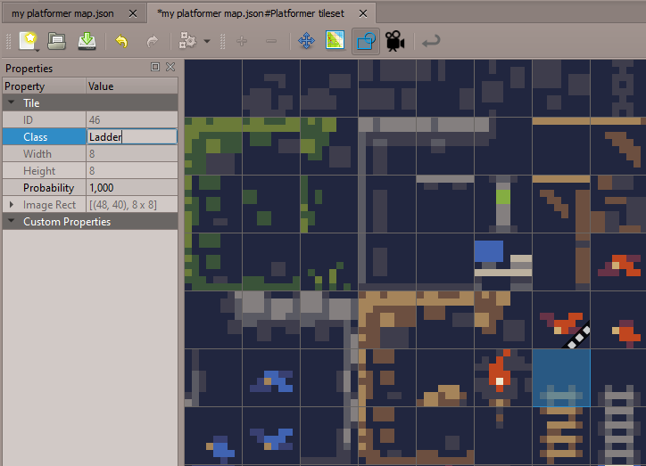 As explained in the previous section, collision masks can be split in several parts to handle platforms, ladder etc. In order to do this, the "Class" field must be set on tiles with Tiled.