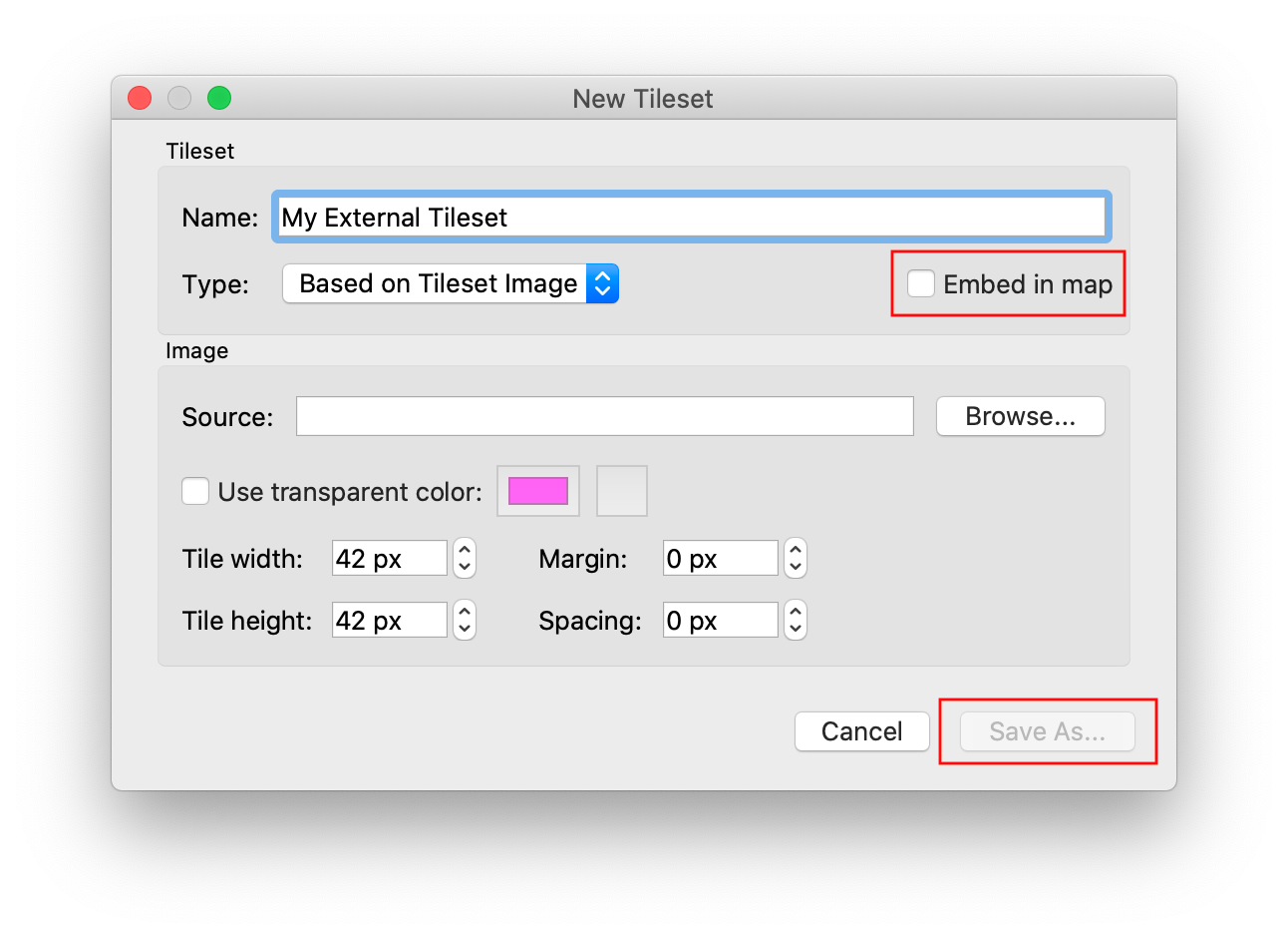 You can choose Embed in map so that the tileset data is stored inside the Tilemap JSON file. If you don't, you'll be asked where to save the Tileset JSON file, and you'll need to select this file in GDevelop too when setting up the tilemap. See the section "Choosing between a bundled or external tileset".