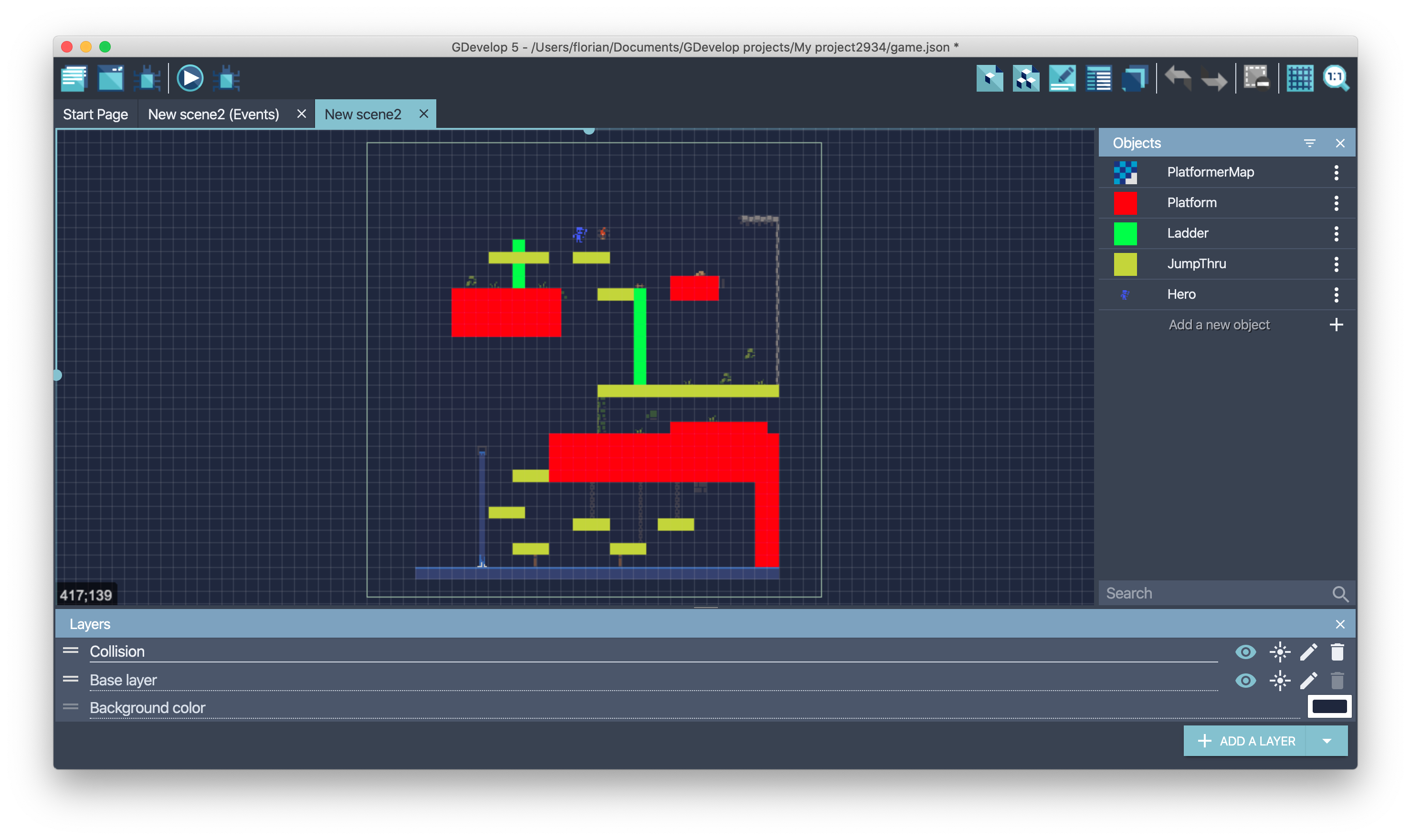 A platformer game often needs different kind of objects like platforms, jumpthru or ladders. One collision mask should be created for each kind. The example in the following screenshots can be opened in the online editor (open the project).
