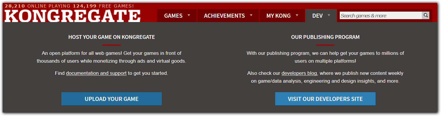 Kongregate no longer accepts game submissions Kongregate is a mobile, PC, and Console publisher and web gaming portal. The website features over 110,000 online games and 30+ mobile games available to the public. On the web portal, users can upload HTML 5/JavaScript, Shockwave, Java or Unity games. It is a great home for your game and can connect you with a thriving community of active and engaged gamers!