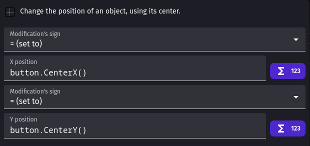 The process for aligning text to other objects is similar. Consider placing a text object on a button. Use the Center position action with X and Y values OBJECT.CenterX()